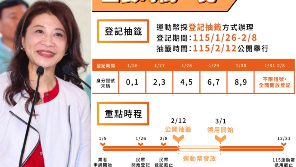 行政院會上周宣布,疫情期間發放的「動滋券」轉型為「運動幣」,針對16歲以上的國民,發放60萬份500元的運動幣,使用於從事運動、看比賽、添裝備等運動消費,自今天(1/26)起至2月8日止開放登記抽籤。對此,有媒體報導,運動幣的中籤機率僅約3%,民進黨立委林楚茵表示,中籤率大縮水,是因為藍白拒審總預算,導致運動部預算卡關。