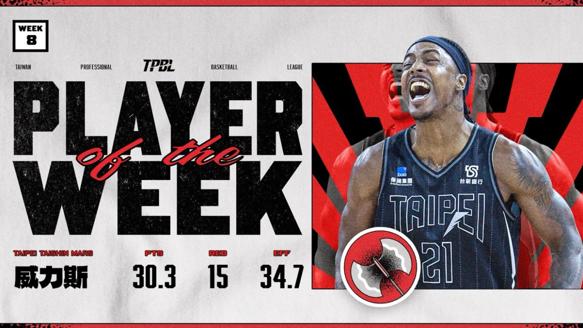 臺北台新戰神洋將威力斯(Darral Willis) 在第八週展現驚人火力與穩定度,三場主場比賽場場繳出雙十表現,並在關鍵戰役中挺身而出,是戰神當週兩勝一敗的重要核心,最終以亮眼數據奪下 TPBL 第八週單週最有價值球員(MVP)。