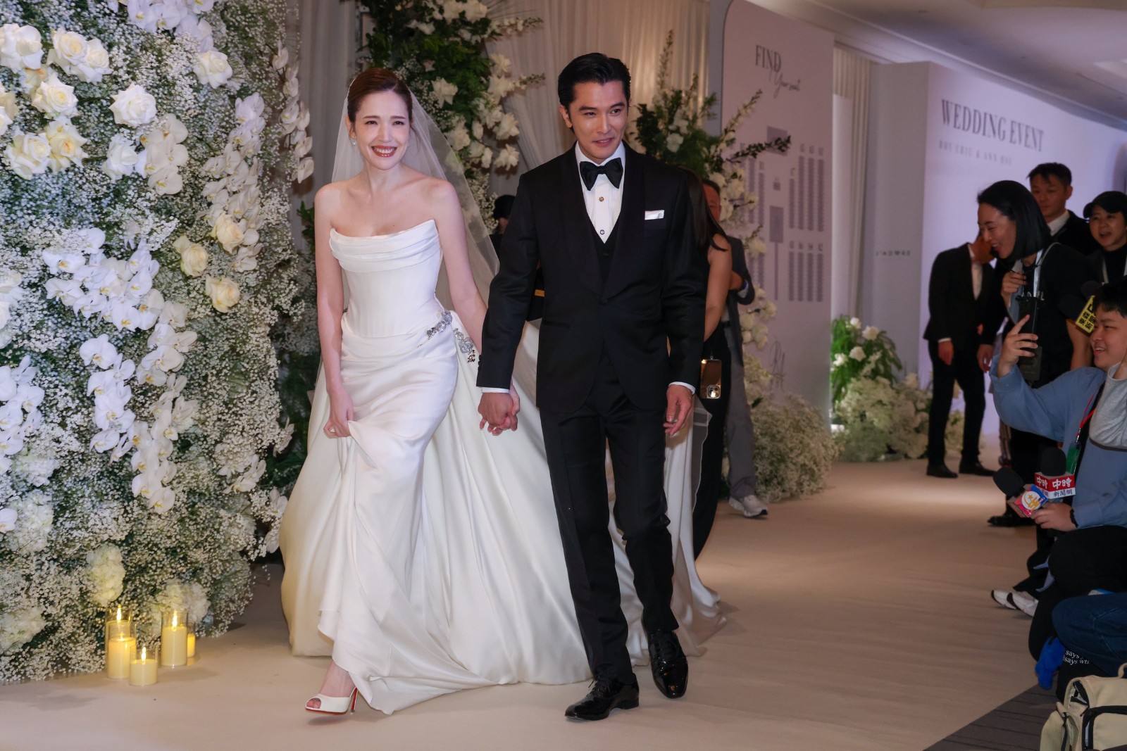 許瑋甯與邱澤結婚4年,今晚(11╱28)終於在台北文華東方酒店舉辦夢幻婚禮,她牽著新郎亮麗現身,小倆口害羞親親、比愛心,5個月大的兒子Ian也沒缺席,邱澤感性表示:「很開心,因為前面很長一段時間彼此都有工作,時間會一直錯開,到半年前我們開始把時間空下來,規劃這個事情,今天真的讓它實現了,我覺得很夢幻。」