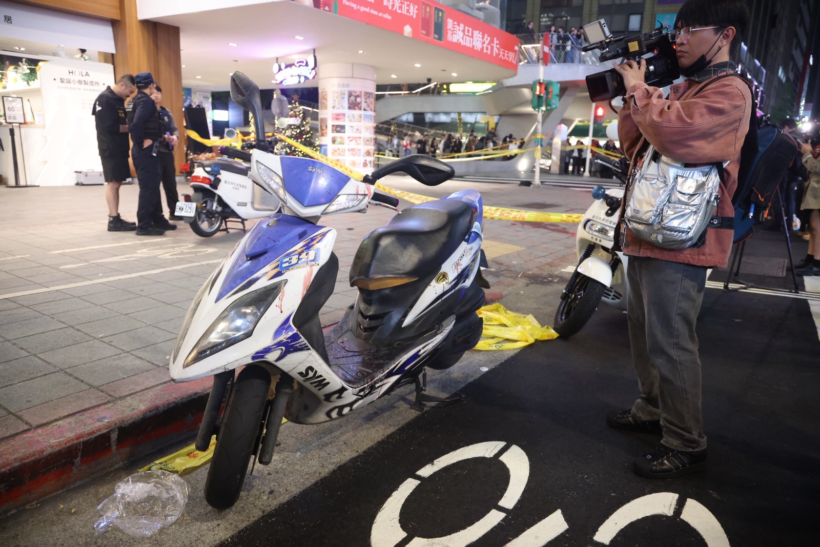 蕭姓騎士往前騎到誠品門口時停下,一邊打電話一邊向警方示意兇嫌去向,最後不支倒地。圖為他遺留現場的機車,上頭血跡斑斑。廖瑞祥攝