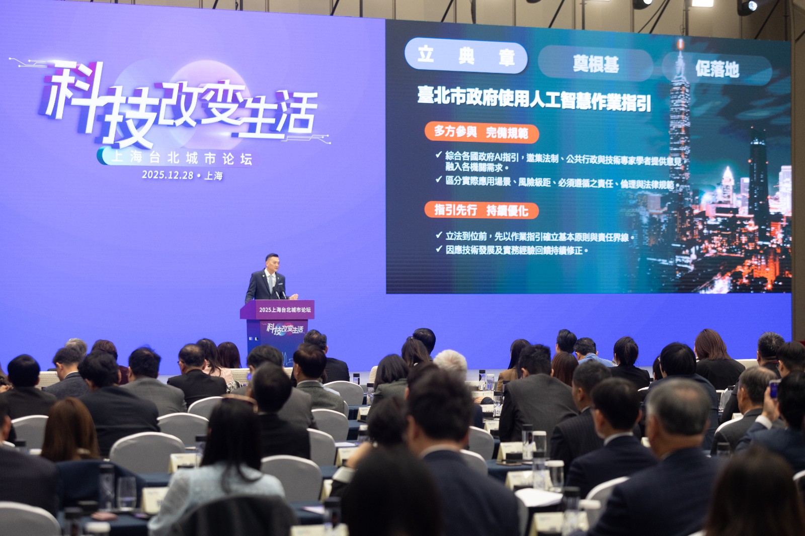2025台北上海雙城論壇在上海舉行,台北市代表報告人工智慧運用情況。台北市政府提供