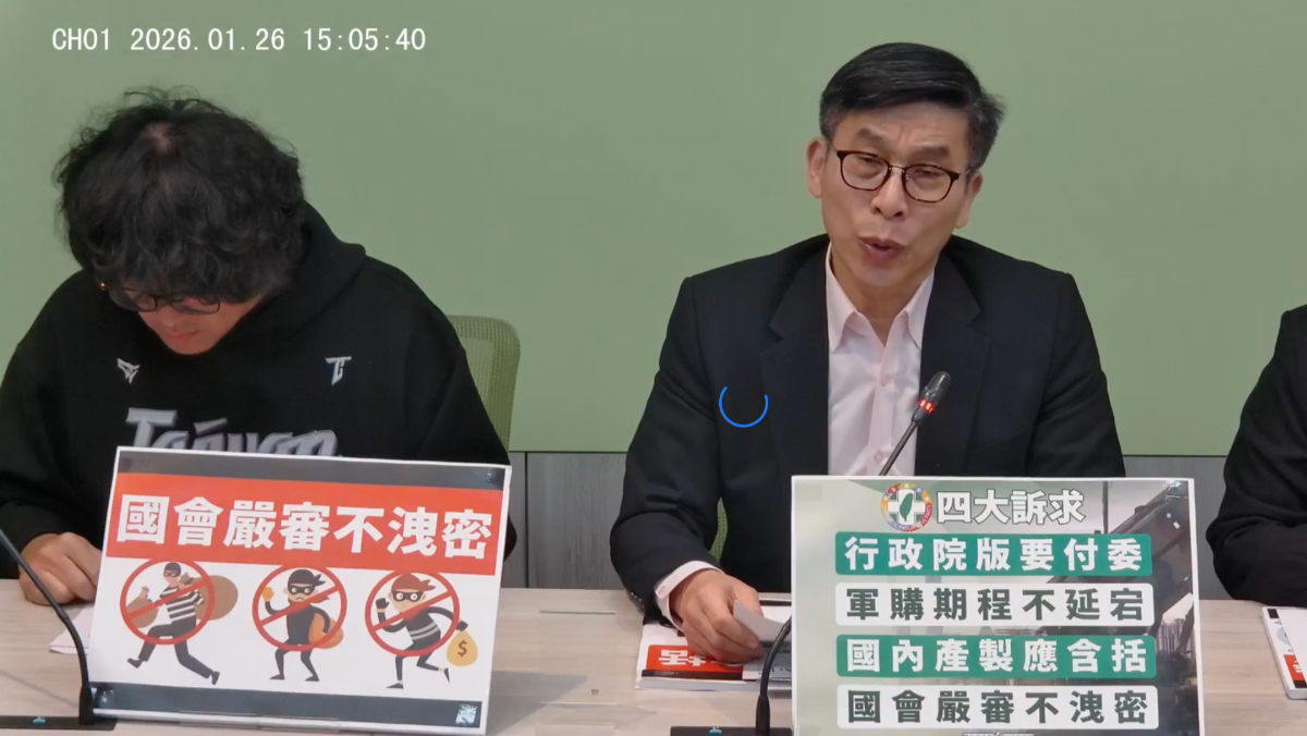 因應賴政府提出德國防特別條例,民眾黨立院黨團今(1/26)推出自提版的「保衛國家安全及強化不對稱戰力計畫採購特別條例 」草案,預算匡列4000億元。民進黨團隨即舉行記者會批是「淘寶版拼多多條例」,呼籲讓行政院版本進入委員會審查,綠委沈伯洋指出,讓版本可以在委員會中討論審查才是最重要的事,他並質疑白版特別條例恐有洩密嫌疑,呼籲國家安全不容打折。