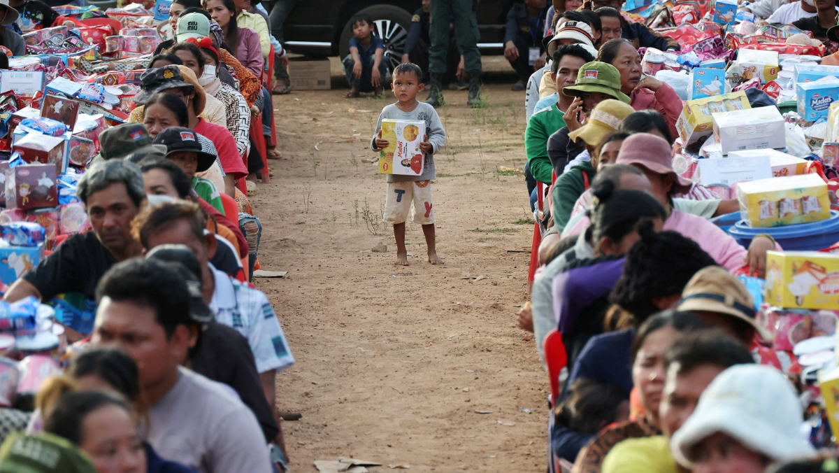 泰柬衝突導致邊境數十萬平民被迫撤離家園。圖為2025年12月12日,柬埔寨邊境一處難民營的民眾等候領取物資。路透社