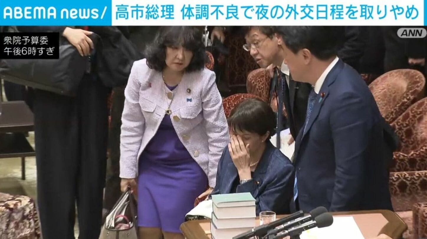 高市原訂當天稍晚要和伊斯蘭國家在東京使節團會面,以及出席開齋節活動,皆臨時取消,由木原代理出席,高市則在晚間6點多時直接回公邸休息,並有醫務官赴公邸為她看診。