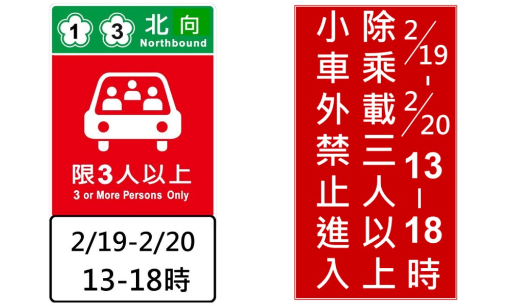 高公局表示,重要路口之高乘載預告標誌採圖形化設計,將以綠底白字標示管制路線及方向,紅底白字標示管制車種及人數,並以白底黑字附牌標示管制日期與時段,內容簡潔明瞭,可有效縮短用路人判讀時間。設於匝道入口的標誌,因須作為執法依據,仍採用紅底白字的文字型禁制性告示牌。