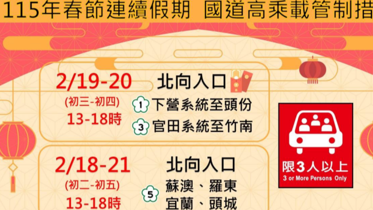 今年春節連假國道實施高乘載管制之路段與時段如下: