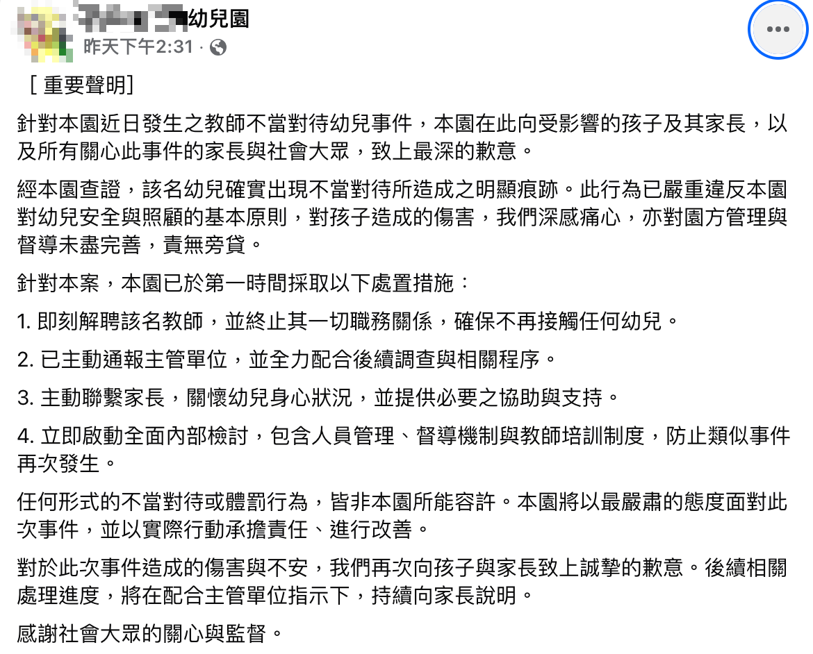 幼兒園也在第一時間採取以下措施,包括即刻解聘該名教師、主動通報主管單位、主動聯繫家長與立即啟動全面內部檢討,並表達最誠摯的歉意。