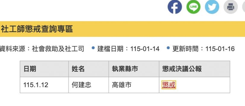 曾獲衛福部「績優督導」前高雄市衛生局心衛中心執行秘書何建忠,涉嫌利用職務權限性侵未成年少女,引發社會譁然。衛福部今(1/21)日表示,懲戒結果已出爐,廢止何建忠的執業執照及社會工作師證書。衛福部也正式設置「社工師懲戒查詢專區」,連結各地方政府公告之懲戒決議公報,供外界查詢。